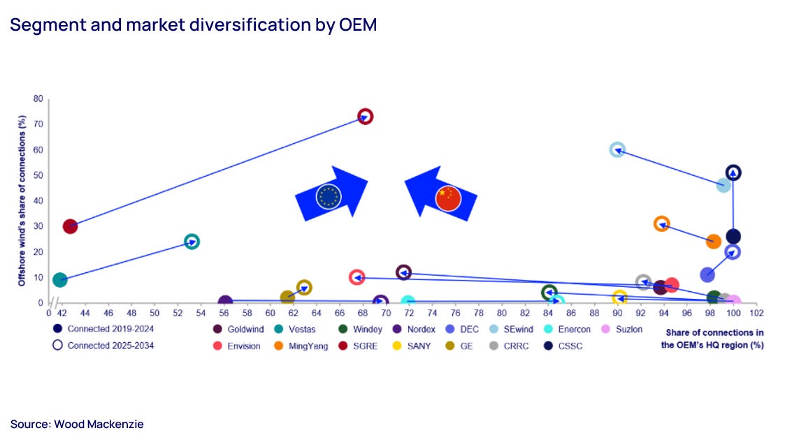 Interesante análisis de Wood Mackenzie en su informe Global Wind Turbine OEMs Market Share Forecast. La industria eólica global entra en una nueva fase marcada por una brecha cada vez más profunda entre el dominio de los fabricantes chinos y la retracción de los OEM occidentales hacia sus mercados tradicionales.