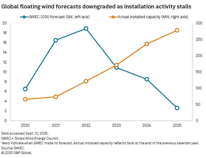 El gráfico que comparte S&P Global es especialmente revelador. El GWEC ha revisado drásticamente sus previsiones en los últimos años: ahora espera “solo” 2,6 GW instalados en 2030, frente a los 18,9 GW que estimaba hace tres años.