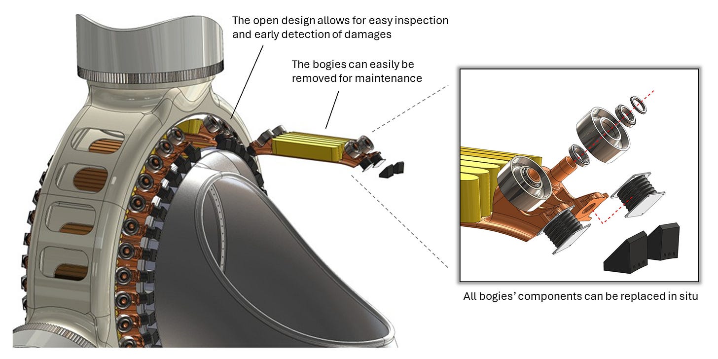 Gracias a este diseño, cada módulo puede sustituirse de forma individual desde el interior de la nacelle, sin necesidad de desmontar todo el conjunto, lo que simplifica las reparaciones y reduce significativamente el tiempo de inactividad de la turbina.