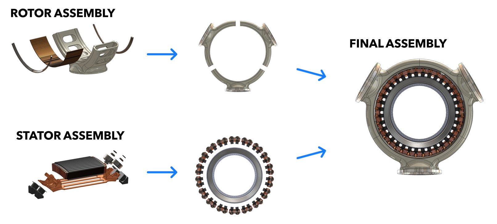 Siguiendo el símil ferroviario, estos conjuntos de ruedas serían los ejes del tren y los rieles las vías por las que se desplaza alrededor del estator.