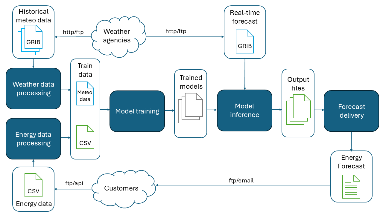 Una vez entrenados (trained models), los modelos necesitan información en tiempo real para realizar previsiones futuras (model inference). Para ello, incorporan pronósticos meteorológicos actualizados de agencias especializadas.