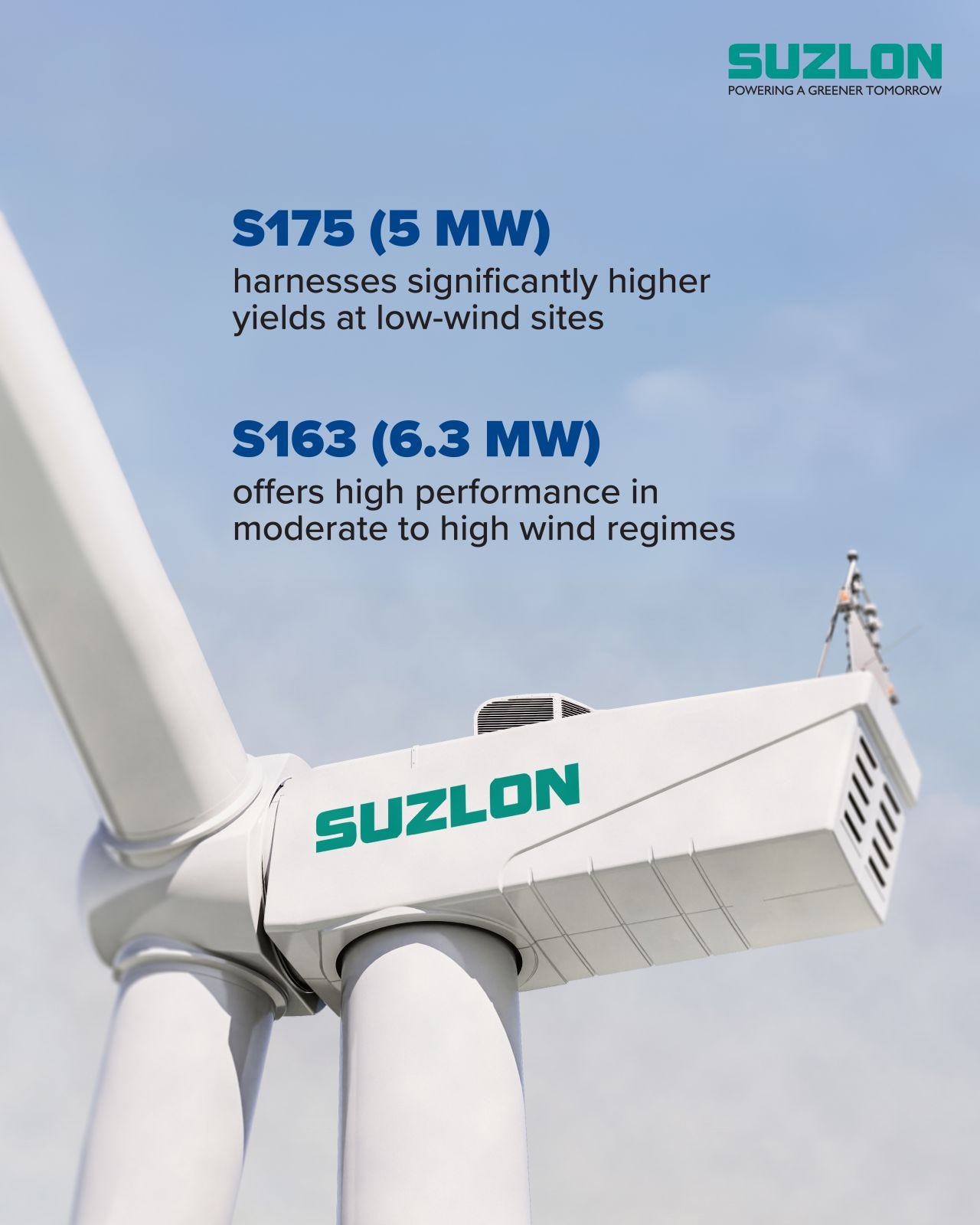 La nueva plataforma cuenta con dos modelos: la S175 de 5 MW para emplazamientos de viento bajo (con baja densidad de potencia), y la S163 de 6,3 MW para sitios de viento moderado-alto. Construida sobre la experiencia de 21,5 GW instalados globalmente, la plataforma apunta a Europa como mercado prioritario. La vuelta de Suzlon merece un análisis en profundidad, y lo tendrá en una próxima edición de Windletter.