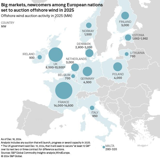 La gente de S&P Global Commodity Insights ha hecho una recopilación de todas las subastas que se van a realizar en este año 2025 en Europa y que suman un total de 45 GW. Y además han decidido ponerlo en un mapa para visualizarlo en un solo vistazo.