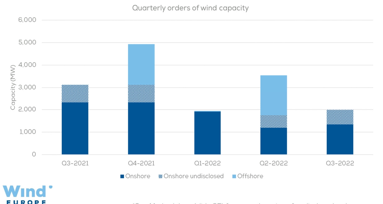 Los nuevos pedidos de aerogeneradores se estancan en Europa. Los objetivos de instalación de los países y la Unión Europea van por un lado y la realidad de las instalaciones por otro. Existe un problema de permitting (de burocracia), pero la inflación y la subida de costes es sin duda uno de los factores más está afectando a esta bajada de pedidos. Los promotores se lo están pensando antes de dar el OK definitivo a las inversiones. Menos pedidos hoy son menos instalaciones en los próximos años. Podéis leer más en AEE.