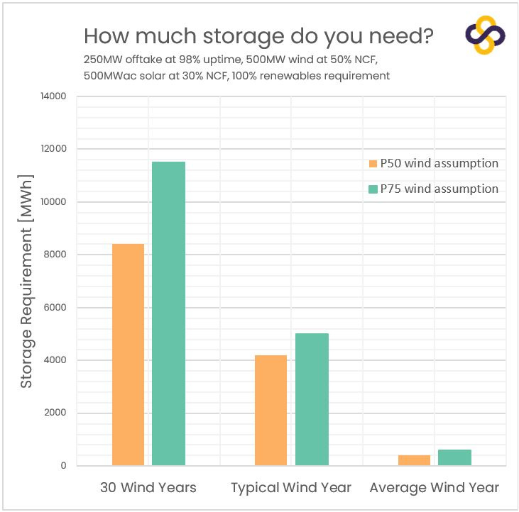 ¿Cuánto almacenamiento haría falta para tener esos 250 MW de potencia firme el 98% del tiempo? Pues hay una gran diferencia dependiendo qué valor consideres para ese dimensionamiento: P50, P75 o considerar 30 años de generación histórica.